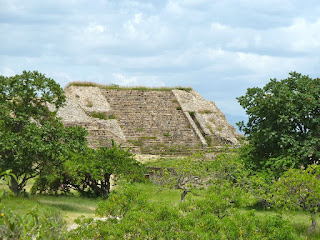 Once down and back to Oaxaca we needed to find Monte Alban to the east of the city. I found it on a street by the same name. Up the mountain on a narrow twisty road we went to the famous ruins. We were not on the regular main road there, but we made it. The ruins covered a huge area with much to explore. Many people must have lived here many years ago. I was thankful for the shade trees as it was very hot. The museum attached to the site showed many rock carvings, etc.