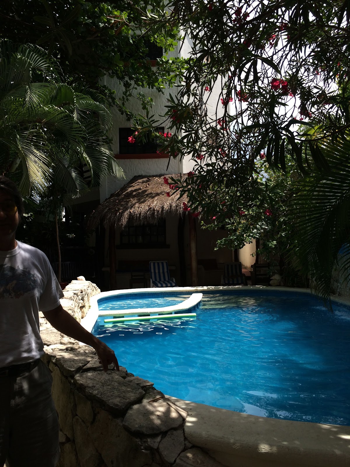 It was really hot in Playa but not as hot as Cancun, must have been the breeze. We found a highly rated little Falafel place on TripAdviser for lunch. After the absolutely delicious, fresh meal we realized there was not enough time to drive to Chetumal and make it before dark. Plus we had to fit in a trip to the Tepoznieves ice cream shop, a chain we have been dreaming of going to for years. Ken located a charming B&B place in a gated community, by accident he wanted add. It had lots of reviews and that were good. The Italian couple from Florence owned it and had a Yorkshire Terrier and a cat that was bigger than the dog. Cute pair - both! The room was huge, clean and nicely decorated. We had a/c and a fan which were very needed on such a hot, humid day.