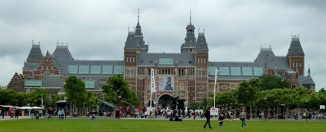 I went into the Rijksmuseum (National Museum) instead, which is definitely World class with painters like Van Gogh, Rembrandt, Vermeer, etc. This museum started in The Hague in 1800 but moved to Amsterdam in 1808, in this building since 1885. It has over a million objects on display. It was another amazing, huge building with a glass atrium in the middle. Each floor had big rooms with a long hallway. Each hallway had about six open fronted rooms off of it. When you walked into a knew area there was a placemat sized card describing at least one piece of art in that area.